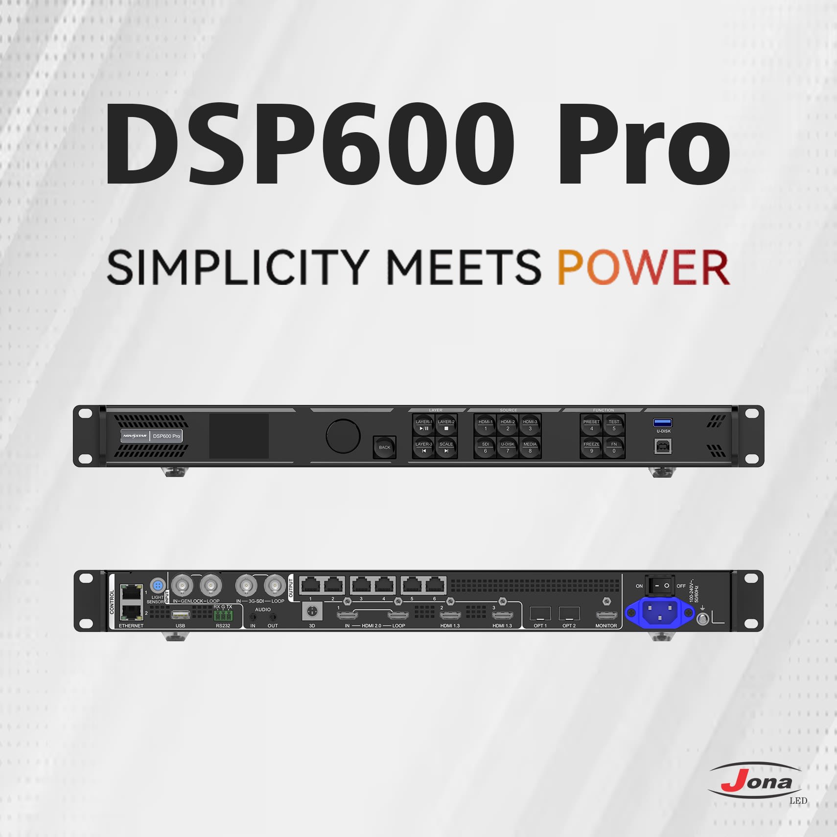 The Novastar DSP600 Pro, part of the all-in-one controller series from Jona LED, is a high-performance LED display controller and video processor built for smooth and reliable LED video wall operation. By combining video processing and control functions into one unit, it simplifies system setup while delivering stable performance. It is well-suited for medium to large LED displays used in digital signage, retail environments, and event installations.