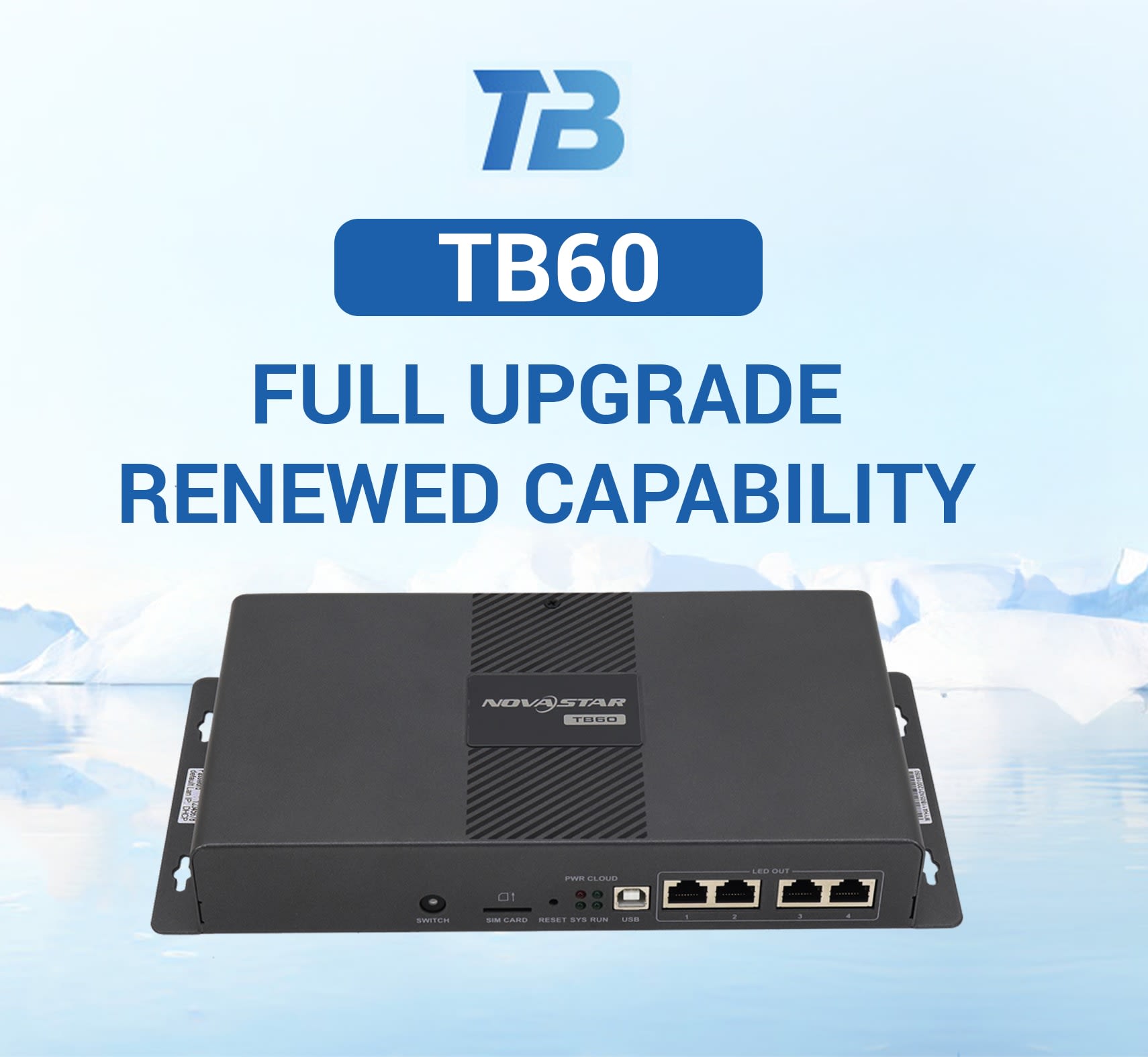 The Novastar TB60 LED controller, available from Jona LED, is a high-performance multimedia LED controller designed for large-scale LED video wall and digital signage applications. As part of the Taurus Series, it combines powerful media playback, storage, and LED display control into a single unit, making it ideal for outdoor LED screens, advertising networks, and multi-location display systems that require stable and continuous operation.